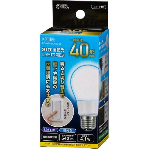 オーム電機で「E26口金」「一般形」「昼光色」「白熱電球40W形」「密閉器具対応」のLEDだと、以下の商品が後継品になります。